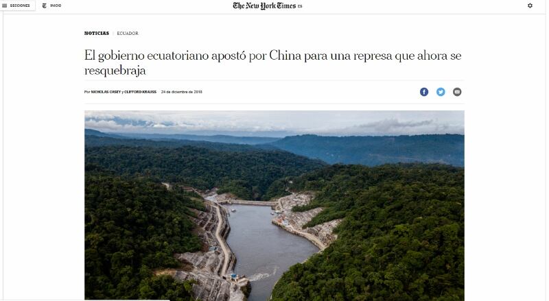 ‘El Gobierno ecuatoriano apostó por China para una represa que ahora se resquebraja’ es el título de la nota que publicó The New York Times, el pasado 24 de diciembre, sobre la situación de la central hidroeléctrica Coca Codo Sinclair y las relaciones con China.