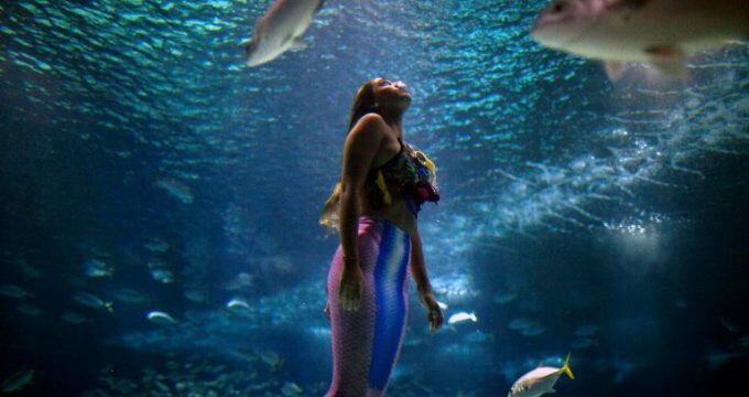 Con su cola rosada y azul ondeando en sincronía con su cabello largo, la sirena Isabela genera una onda de clicks y gritos de niños y adultos que siguen todos sus movimientos en el principal tanque del Acuario de Rio de Janeiro.