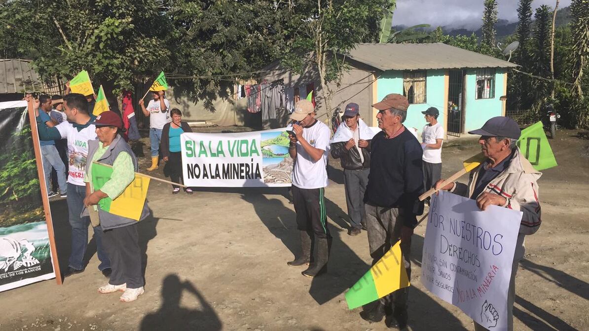 Unos doscientos campesinos de Pacto, parroquia rural de Quito, en Pichincha, realizaron un plantón pacífico esta mañana en contra de la empresa minera Melinachango Santa Bárbara que intentó realizar hoy la socialización del proyecto para la exploración y explotación de materiales metálicos (oro y plata) de la concesión Melina.
