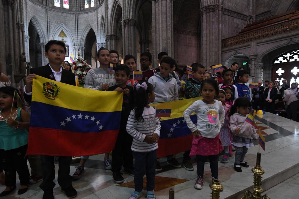 Niños abrazando banderas de Venezuela, jóvenes portando imágenes de la Virgen de Coromoto -patrona de Venezuela-, adultos llevando zapatos y pasaportes para entregar como ofrendas es lo que se observó este mediodía en la Basílica del Voto Nacional, en Quito, donde por casi dos horas ecuatorianos, venezolanos y de otras nacionalidades se congregaron en una misa para pedir por la paz en Venezuela.