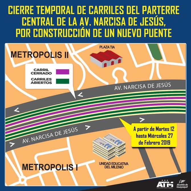 Desde este martes 12 hasta el 27 de febrero la Autoridad de Tránsito Municipal (ATM) cerrarán temporalmente un carril central de cada lado de la autopista Narcisa de Jesús. Así lo indicó mediante un comunicado de prensa la entidad.