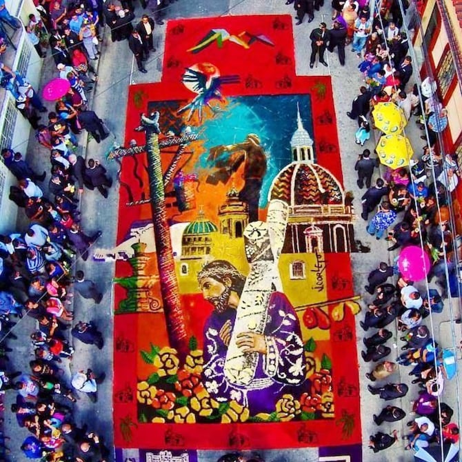 Durante la Semana Santa es tradición en Guatemala elaborar alfombras que representan figuras folclóricas y religiosas. Estas artesanías son realizadas con aserrín, flor de corozo, rosas, hojas de palma y otros materiales orgánicos, indica el portal guatemala.fandom.com.