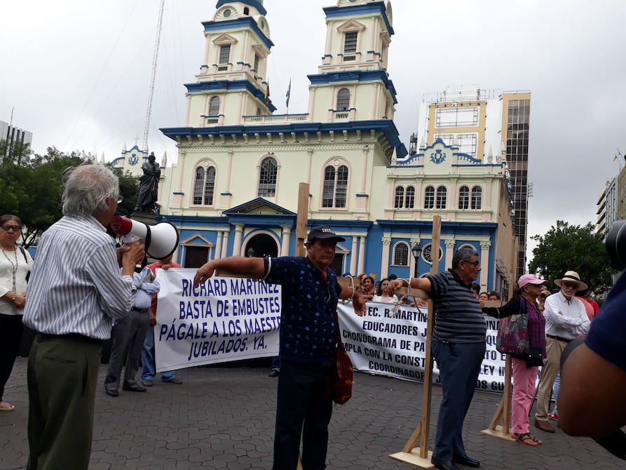 Maestros jubilados protestaron este miércoles en la plaza San Francisco, centro de Guayaquil, para reclamar el pago del incentivo jubilar, que afirman no recibirlo desde 2008.