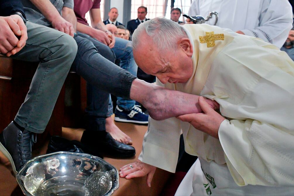 El papa Francisco celebró por quinta vez una misa del Jueves Santo en una prisión, en la que lavó los pies de 12 detenidos, en Roma, un gesto de "fraternidad" y "servicio".
