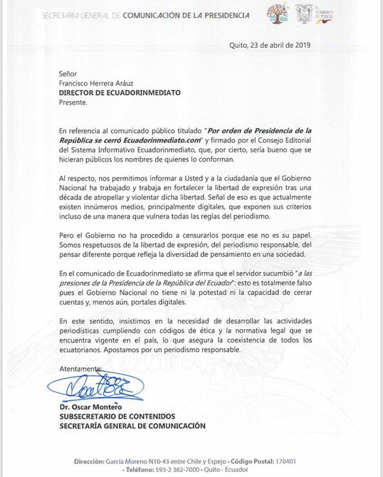 El secretario de Contenidos de la Secretaria General de Comunicación de la Presidencia, Oscar Montero, rechazó la noche de este martes, a través de un comunicado, que el Gobierno haya tenido que ver con el cierre del portal digital Ecuadorinmediato.