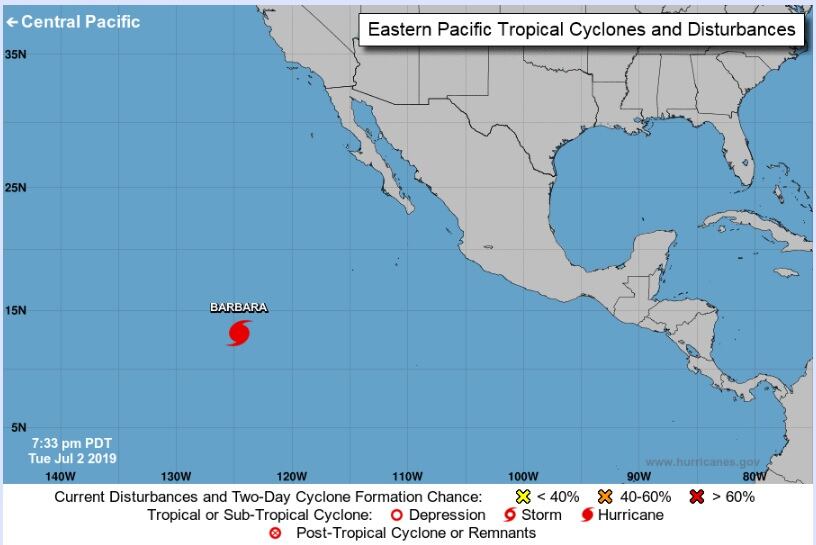 El huracán Bárbara acumuló fuerza rápidamente este martes y está por alcanzar la categoría 5 mientras se desplaza con dirección oeste-noroeste sobre el Pacífico y se aleja de tierra firme.