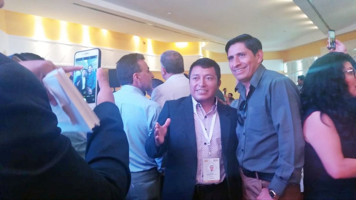 Varios de los alcaldes que llegaron a la asamblea general de la Asociación de Municipalidades del Ecuador (AME), que se realizó este viernes en Salinas, no pasaron desapercibidos como el alcalde de Guamote, Delfín Quishpe, que se dio a conocer artísticamente por su canción las Torres Gemelas.