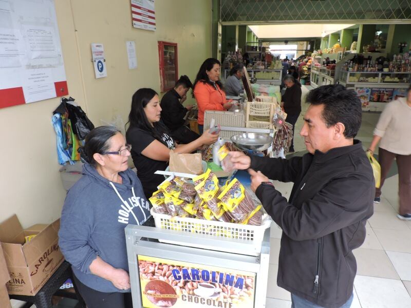 Jessica Villavicencio, Clara Guerrero, Herminia López y Magdalena Guerrero se ubican los lunes de feria en una de las puertas de acceso al mercado Central para seguir con la tradición de sus antepasados. Ellas venden el chocolate ambateño, además de la máchica, complemento con el que se elabora el chapo, bebida andina típica.