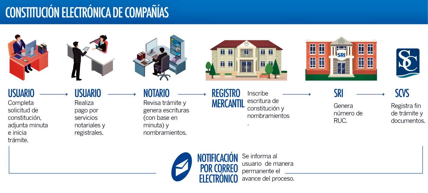 La creación de un proceso más simplificado con el uso de internet mermó el tiempo promedio que se emplea para formar una compañía en Ecuador. El mecanismo se denomina constitución electrónica con el objetivo de reducir los trámites que implicaban ir a las oficinas de la Superintendencia de Compañías, Valores y Seguros (SCVS).