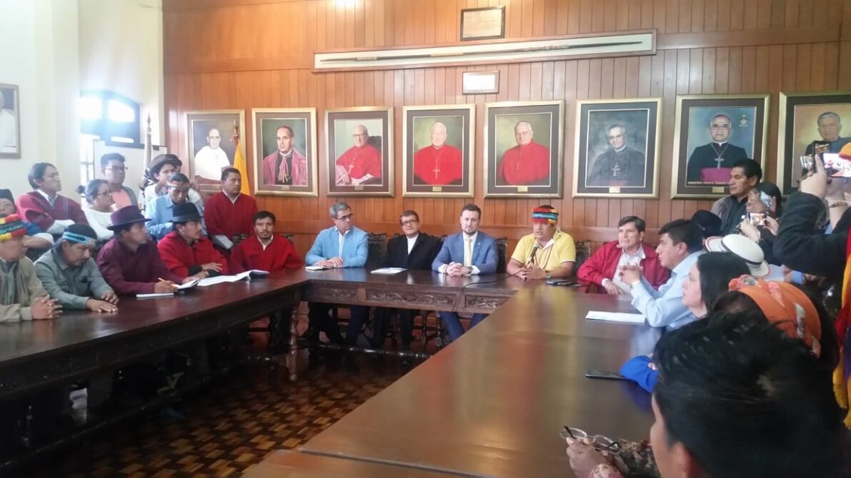 En la Conferencia Episcopal Ecuatoriana se reúnen delegados del Gobierno, como José Agusto Briones; el coordinador de ONU Ecuador, Arnaud Peral; para recibir propuestas de la Confederación de Nacionalidades Indígenas (Conaie) sobre un plan económico para Ecuador.