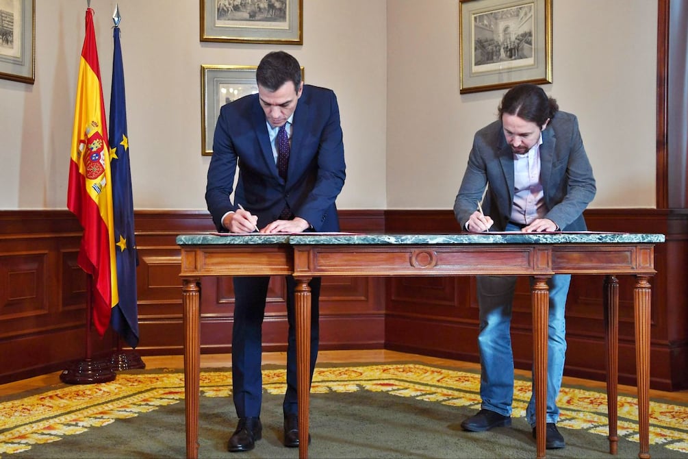 El presidente de España, Pedro Sánchez, logró llegar a un acuerdo con el jefe de la izquierda radical de Podemos, Pablo Iglesias, para formar un gobierno de coalición en España, que tiene un sistema parlamentario, razón por la que el jefe del gobierno se escoge en el Congreso.