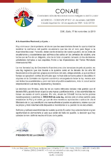 La Confederación de Nacionalidades Indígenas del Ecuador (Conaie), mediante un comunicado difundido este domingo 17 de noviembre, pidió a la Asamblea el archivo del proyecto urgente de ley de Crecimiento Económico.