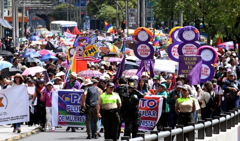 Por las calles de Quito, cientos de mujeres, niñas, adolescentes, adultas y adultas mayores, blancas, mestizas, afroecuatorianas e indígenas amazónicas y serranas, se concentraron, desde las 10:00, en diferentes puntos del centro norte de Quito para marchar en conmemoración del Día Internacional de la Mujer hacia la plaza de Santo Domingo, en el centro histórico de la capital.