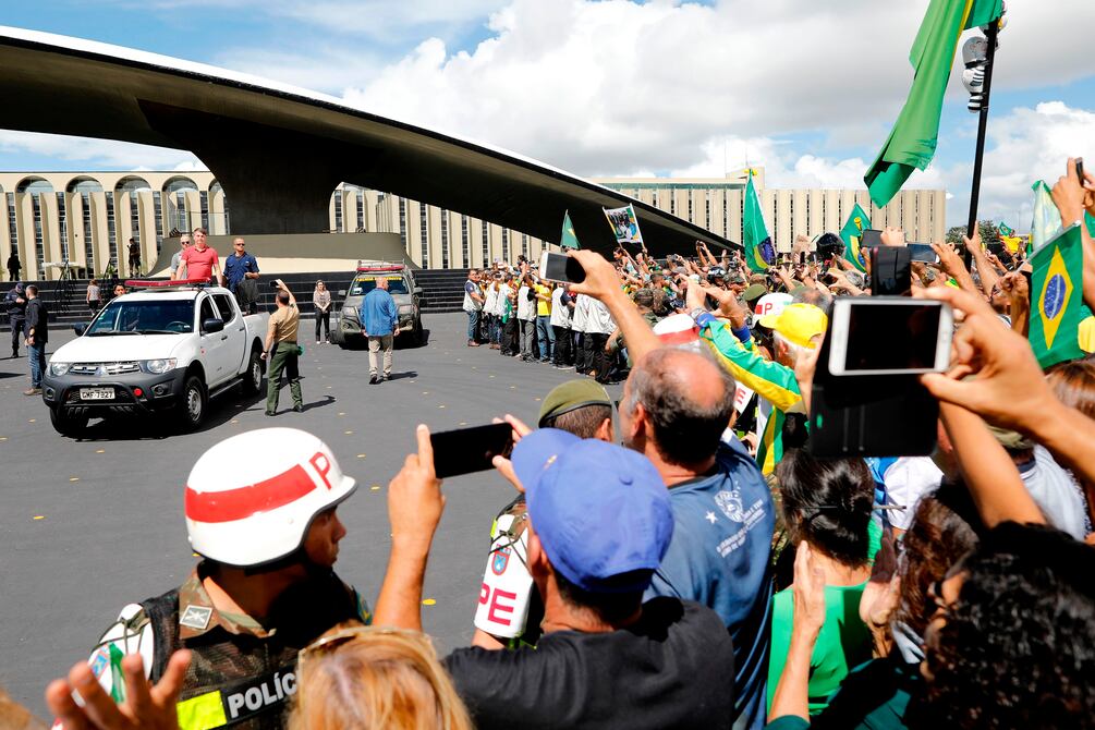"Estoy aquí porque creo en ustedes y ustedes están aquí porque creen en Brasil", gritó Bolsonaro frente a la aglomeración de la cual se mantuvo unos metros distante. Niños y ancianos, algunas personas con máscaras, estaban en la primera línea de la manifestación que reunió a unas 600 personas.