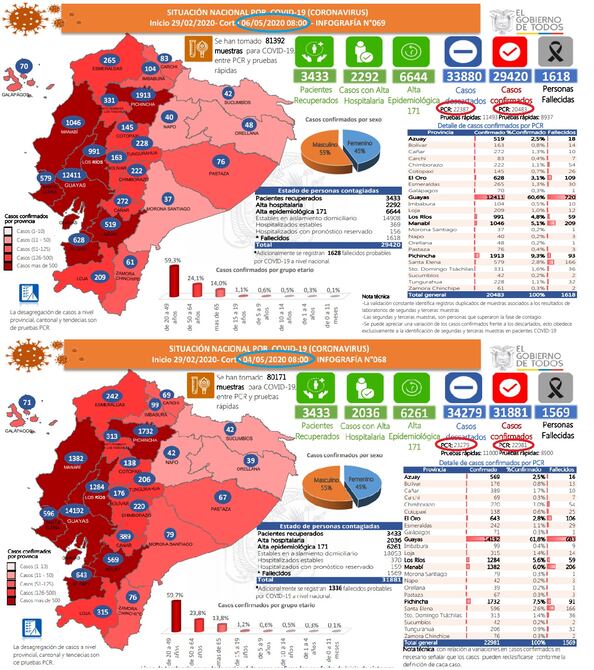 El Comité de Operaciones de Emergencia (COE) nacional presentó este miércoles una variación hacia la baja en las cifras de casos confirmados y descartados de coronavirus en Ecuador, en base a las pruebas PCR (biología molecular) tomadas por los diversos laboratorios del país.