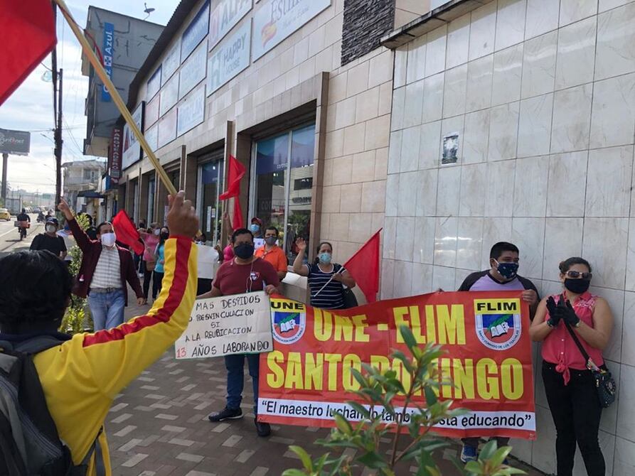 Un grupo de docentes afiliados a la Unión Nacional de Educadores (UNE) y otras organizaciones del magisterio de Santo Domingo de los Tsáchilas protestaron durante la visita de la ministra de Educación, Monserrat Creamer, quien entregó 348 chips y 16 tablets a docentes de varias unidades educativas de esta provincia.