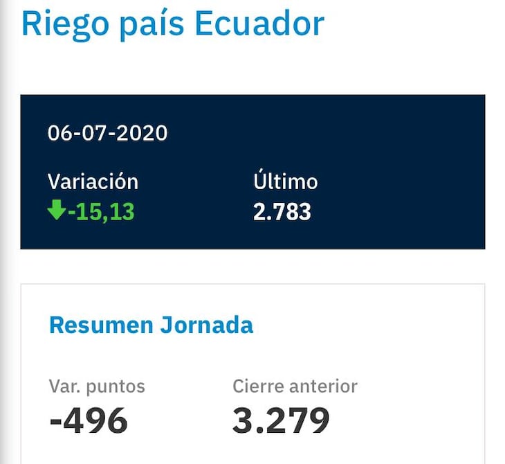 El Riesgo País de Ecuador se colocó esta tarde en 2783 puntos. Se trata del índice mas bajo desde los primeros días de marzo de este año. La baja se produce tras el anuncio del Gobierno de que llegó a un acuerdo previo con un importante grupo de tenedores de bonos, en medio del proceso de reperfilamiento de deuda que lleva a cabo desde el 3 de junio pasado.