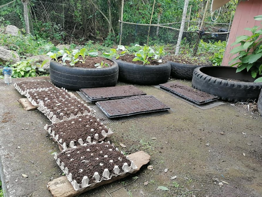Usan cubetas de huevos, tubos de papel higiénico y bases de botellas de plástico para la germinación de las plántulas. Llantas usadas y envases plásticos sirven de maceteros de plantas aromáticas, para condimentos, vegetales y frutas.