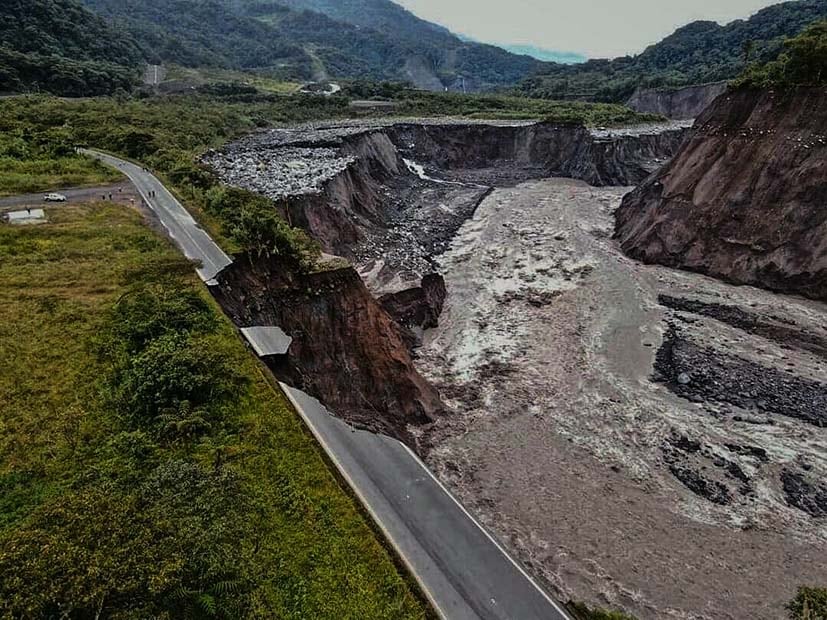 El Ministerio de Obras Públicas informa el cierre de la carretera “Y” de Baeza – Lago Agrio, sector El Reventador, en el kilómetro 66, debido a la pérdida de mesa por la erosión del río Coca.