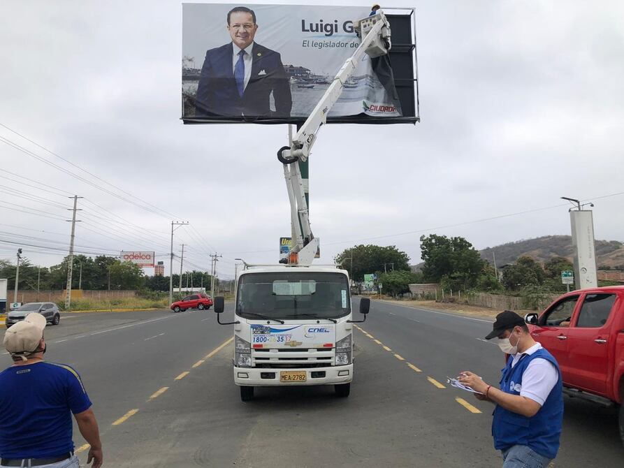 Personal de la delegación del Consejo Nacional Electoral (CNE), de Manabí, procedió a retirar tres vallas que promocionaban la imagen de Luigi García, precandidato a asambleísta en esta provincia en representación del movimiento Avanza.