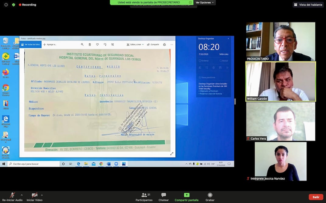 La ex ministra de Salud, Catalina Andramuño, con un certificado de salud del hospital del IESS de Los Ceibos en Guayaquil, se excusó de comparecer vía telemática ante la Comisión de Salud a explicar sobre las omisiones en el control de la entrega de los carnés de discapacidad mientras ejerció el cargo.