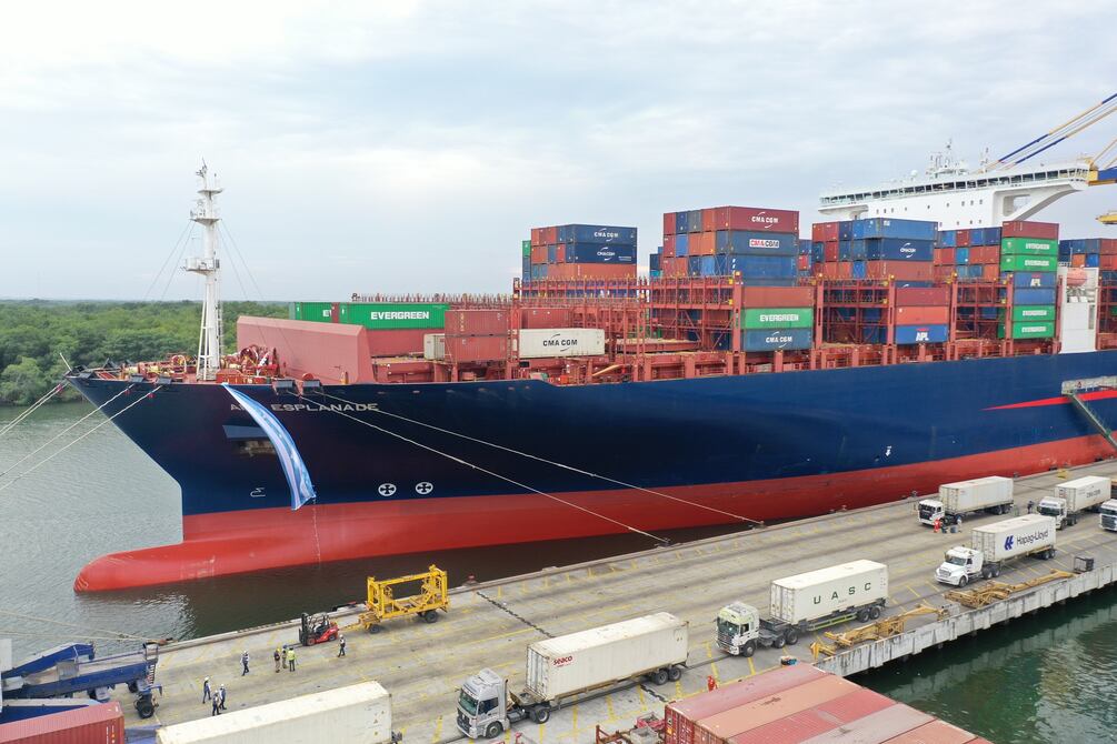 Con una bandera de la ciudad en la proa, el buque APL Esplanade, de la naviera CMA CGM, atracó en el muelle del Terminal Portuario de Guayaquil (TPG), en el estero Santa Ana, en la isla Trinitaria.