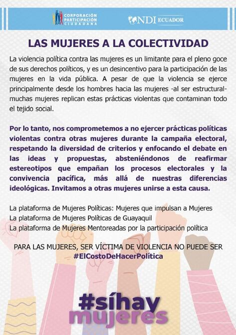 Con el pulgar arriba de los participantes terminó la tarde de hoy jueves 19 el evento virtual de lanzamiento de la campaña El costo de hacer política, que impulsa la Corporación de Participación Ciudadana ,y que incluye el Pacto de no agresión entre mujeres candidatas para dejar de lado la violencia política y sustituirla por el debate de ideas y análisis de propuestas.