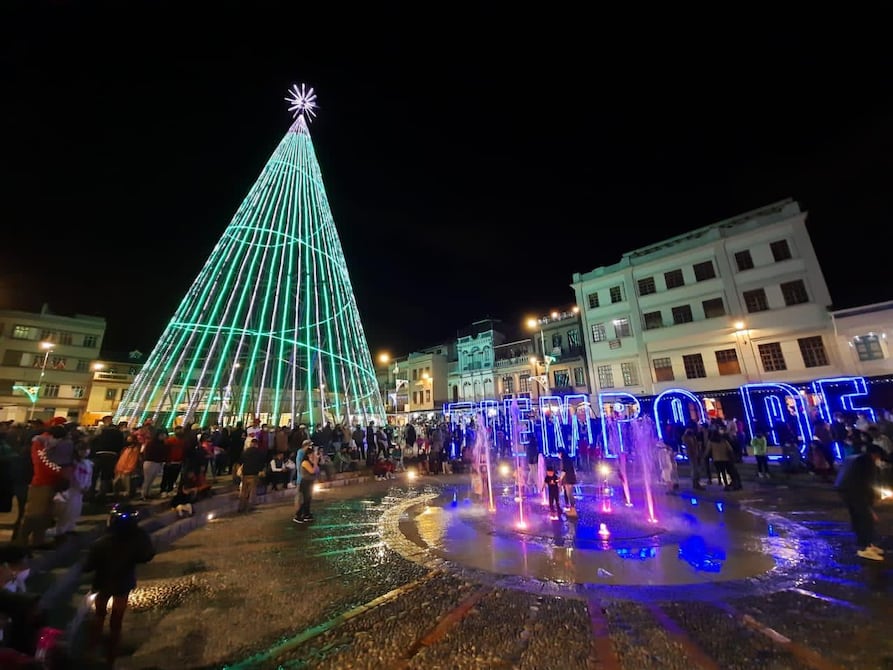 El árbol de Navidad gigante de la ciudad se encendió esta noche. La estructura metálica de 35 metros de alto se ubicó en la céntrica plaza de San Francisco, a dos cuadras del Parque Calderón.