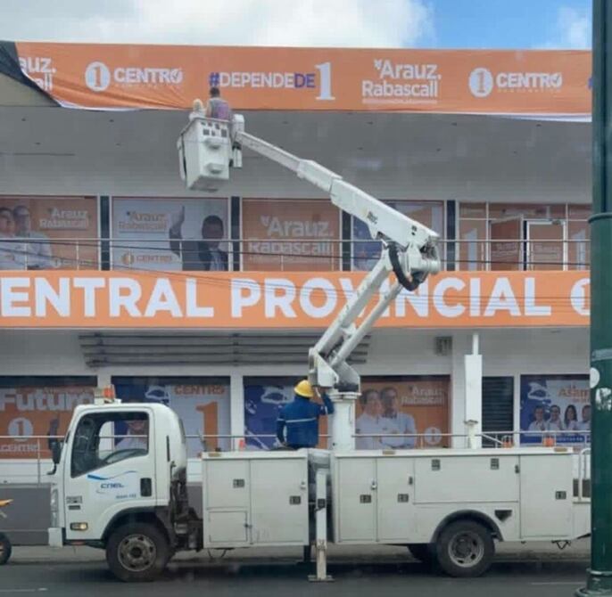 La Corporación Nacional de Electricidad (CNEL), anunció investigaciones y aceptó la renuncia de un funcionario, luego de que a través de redes sociales se divulgara la utilización de un carro canasta de esta institución para ayudar a pegar soporte publicitario en la sede provincial del movimiento Centro Democrático (CD) en Portoviejo.