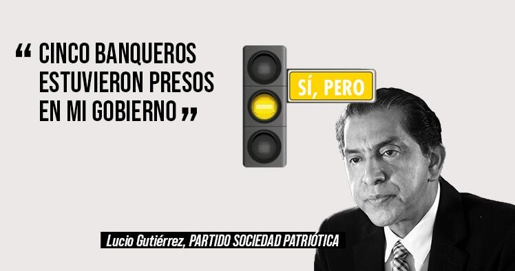 El expresidente y ahora nuevamente candidato a la presidencia por el Partido Sociedad Patriótica (PSP), Lucio Gutiérrez, afirmó que durante su gobierno (enero 2003 – abril 2005) “cinco banqueros estuvieron presos”. Así lo indicó en una entrevista con el medio digital GK. Los banqueros a los que se refiere el candidato sí estuvieron encarcelados por su participación en el feriado bancario, pero no fue por gestión de Gutiérrez, sino por procesos judiciales iniciados antes de su mandato.