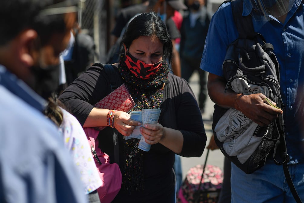 Una mujer con un dólar en la mano hace fila para subir al autobús. El chofer cobra y entrega a cambio un fajo de los erosionados billetes de Venezuela, que parecen condenados a extinguirse. La operación se repite una y otra vez.