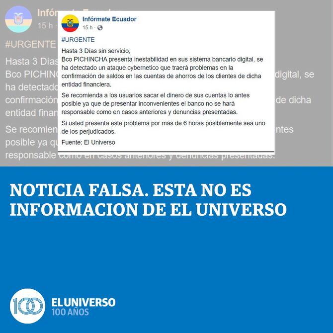 Decenas de ciudadanos han expresado en redes sociales el malestar sobre inconvenientes e intermitencias en el servicio de la banca web y aplicaciones móviles del Banco Pichincha desde el último fin de semana. Diario EL UNIVERSO alerta a los usuarios sobre una publicación que desinforma y que no pertenece a esta casa editorial.