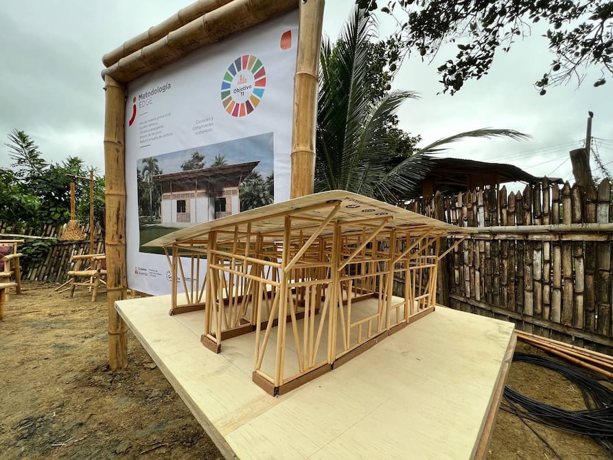 El primer prototipo de vivienda de bambú que se construirá en el cantón Olmedo, de la provincia de Manabí, se ejecuta en el marco del proyecto ‘Escuela Taller Manabí Construcciones Sostenibles con Bambú’ que implementa la Organización Internacional del Bambú y Ratán (INBAR) con el financiamiento de la Agencia Española de Cooperación Internacional para el Desarrollo (AECID).