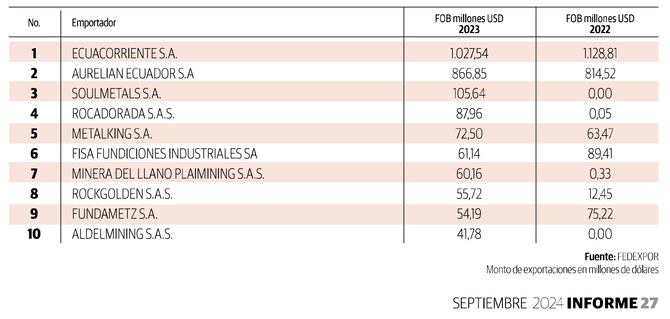 Con tan solo dos minas en fase de explotación, las exportaciones crecieron 10 veces más, pues en 2019 representaron $326,4 millones, y hoy superan a productos tradicionales como cacao, atún y pescado, y flores.