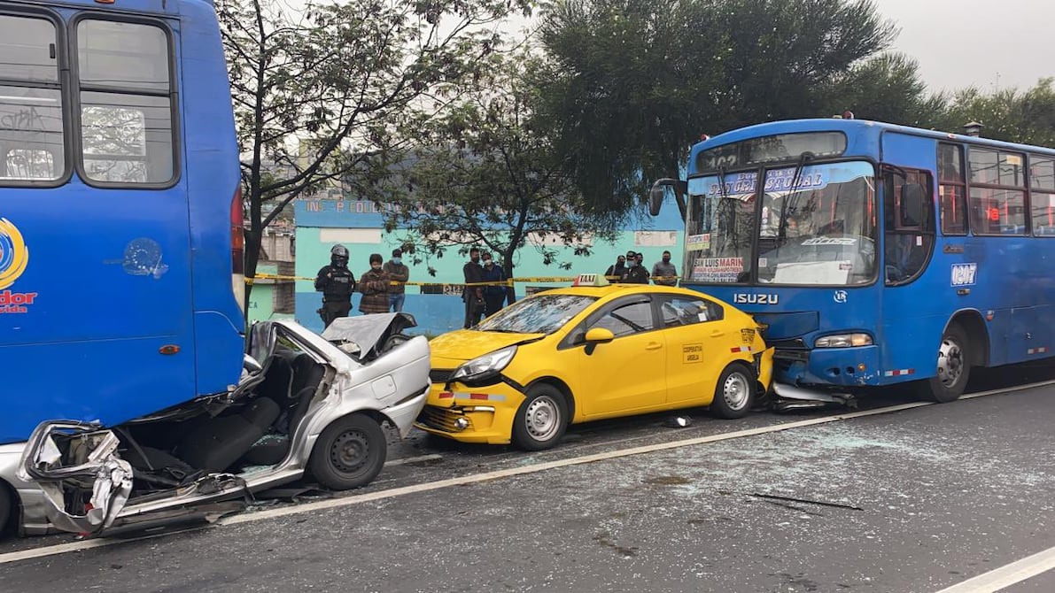 Un choque de cuatro vehículos en la avenida Teniente Hugo Ortiz provocó el cierre de esta vía en sentido sur-norte. Dos buses y dos autos están involucrados en el accidente a la altura de la parada Quito Sur del Trolebús.