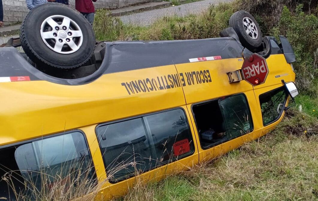 La lluvia del jueves 23 de octubre en Quito dejó una furgoneta escolar volcada y cinco niños heridos al borde de un terreno baldío, adonde el automotor cayó después de perder el control sobre la vía.
