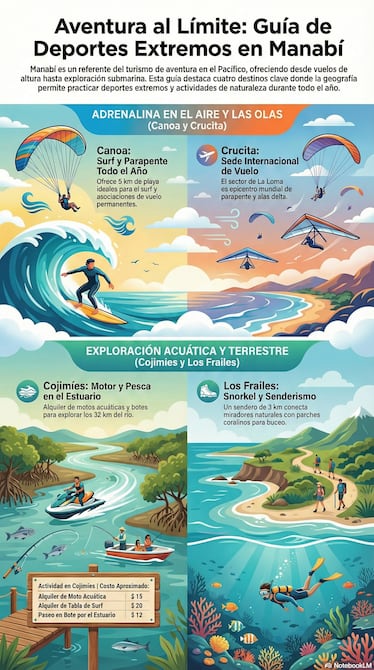 Canoa ofrece cinco kilómetros de playa apta para surf y parapente. Existen asociaciones que operan vuelos durante todo el año. La oferta hotelera incluye opciones desde $ 12 por noche hasta establecimientos de mayor categoría. Restaurantes especializados en mariscos y cerveza artesanal complementan la experiencia.