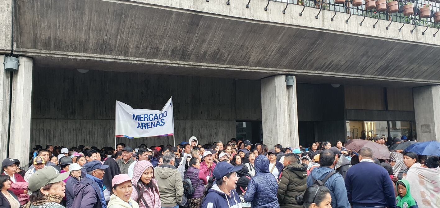 Unos 150 comerciantes de 37 mercados se concentraron la mañana de este lunes en los exteriores del Municipio de Quito en contra de un proyecto de reforma a una ordenanza metropolitana.