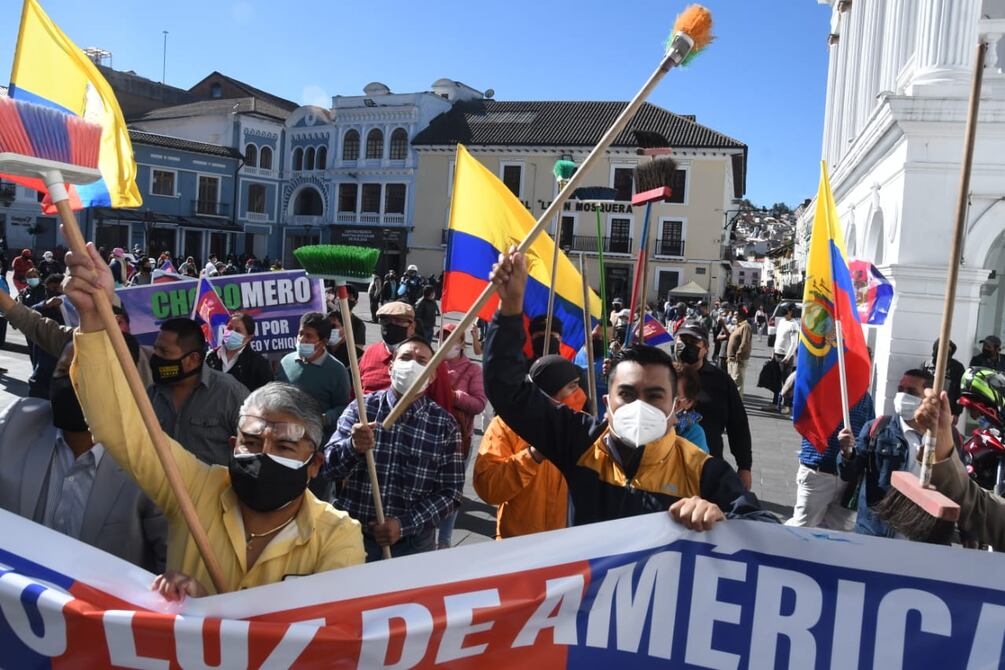 Con pancartas, megáfonos, escobas y banderas de Quito, varias personas se apostaron en la Plaza del Teatro, en el centro de la ciudad, para reclamar en contra de la gestión realizada por Jorge Yunda como alcalde de la capital.