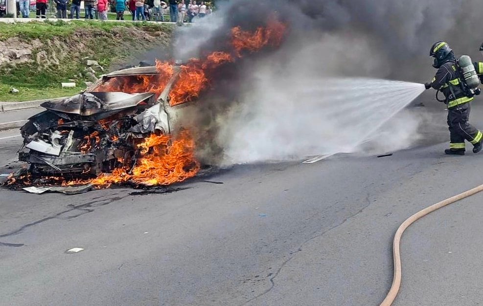 Alrededor de ese vehículo se observó humo blanco y hubo la presencia de personal del CBQ, institución que informó que el incendio vehicular estaba controlado y que aparentemente se debió a un sobrecalentamiento de las llantas traseras.