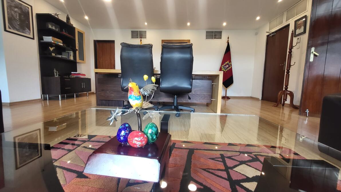 Sobre el reluciente piso de madera, una alfombra rectangular se ubica en el centro de una pequeña sala con sillones de cuero. En el centro, una mesa con base de madera y un techo de vidrio soportan un solitario pero colorido adorno de un ave característica de Quito: el colibrí.