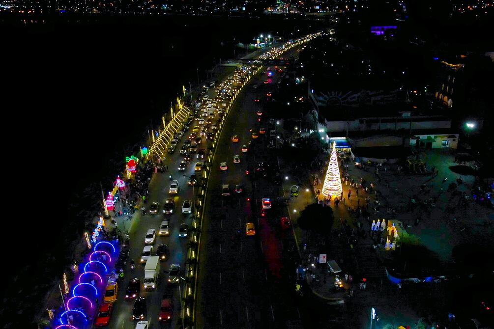 En unos 400 metros lineales, el Municipio de Manta desplegó más de 300.000 luces que acompañan a un árbol, dos muñecos de Papá Noel, y otras distracciones que generan este mes la movilización de miles de personas cada noche a la avenida Malecón Jaime Chávez Gutiérrez.