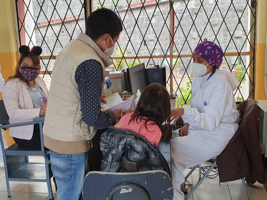 Benjamín Zamora, de 5 años 2 meses de edad, recibió la primera dosis contra el coronavirus en la Unidad Educativa Municipal Sucre, en el centro de Quito, este jueves.