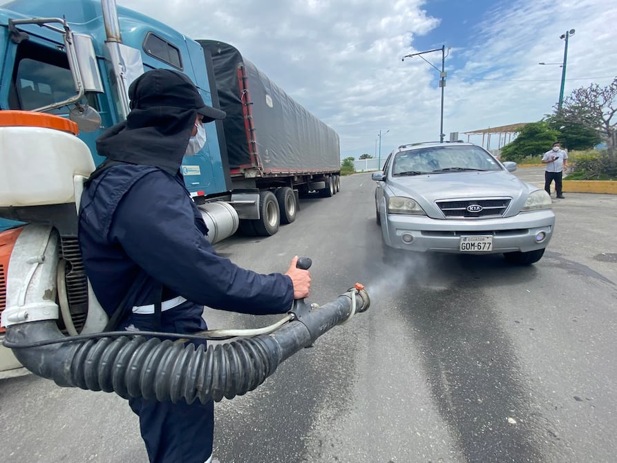 Los vehículos y personas que provienen de Perú son fumigados antes de cruzar el Centro Binacional de Atención Fronteriza (Cebaf), en el cantón Huaquillas, provincia de El Oro.