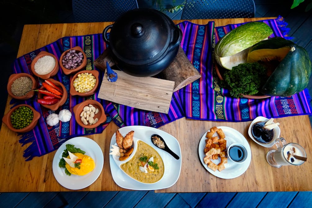 Una mesa con manteles de distintivos andinos, una vasija de barro y un pequeño cucurucho, muestran el plato de fanesca que parece un rompecabezas del sabor, al tener la sopa por un lado y los aperitivos en otro espacio.