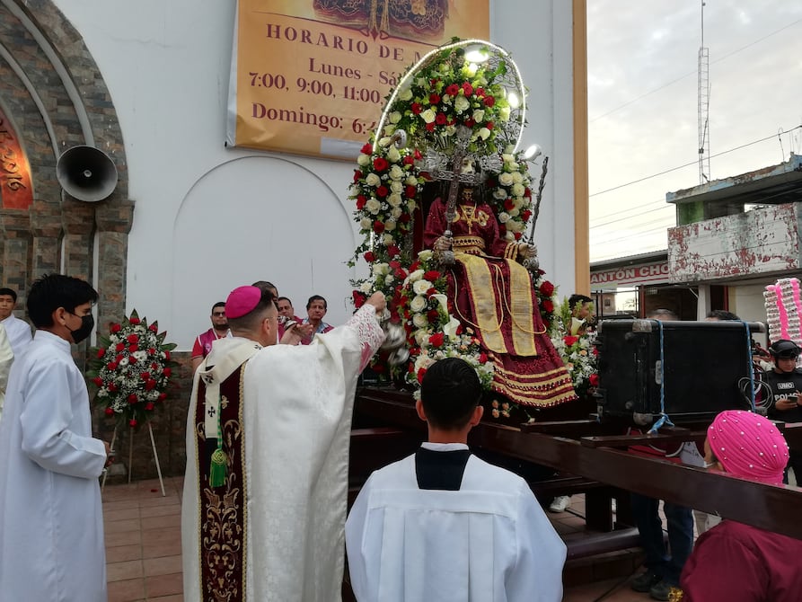 Con la imagen del Señor Jesús de la Buena Esperanza sentado en su trono y adornado con flores rojas y blancas, se dio inicio a la misa campal en homenaje al patrono del cantón manabita de Chone, a las 18:00 de este domingo 31 de julio, en la explanada de la iglesia San Cayetano.