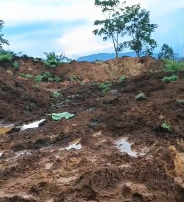 El derrumbe, ocasionado por la fuerte lluvia, se calcula en una extensión de más de 60 metros, por lo que ganaderos ni agricultores pueden pasar ni siquiera con moto, porque todo está cubierto por lodo y vegetación. Incluso es casi imposible pasar caminando.