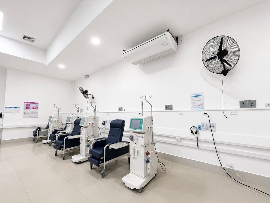 Actualmente se encuentra en proceso la implementación de un moderno sistema de climatización integral que comprende cuatro equipos acondicionadores de aire de 120.000 BTU cada uno, con capacidad suficiente para cubrir de manera total el área de diálisis, así como los consultorios y las salas de espera.