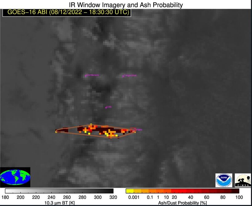 Una nube de ceniza de aproximadamente dos kilómetros se registró desde las 13:00 de este viernes, 12 de agosto de 2022, sobre el cráter del volcán Sangay, en la provincia de Morona Santiago.
