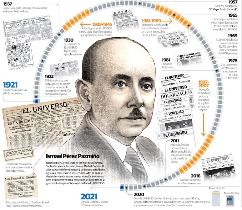 El 16 de septiembre de 1921 nace formalmente Diario EL UNIVERSO. Ismael Pérez Pazmiño es la raíz de este centenario periódico y de una familia de comunicadores. La misión del periódico se mantiene a través de los años y con los cambios tecnológicos solo ha ampliado sus fronteras.